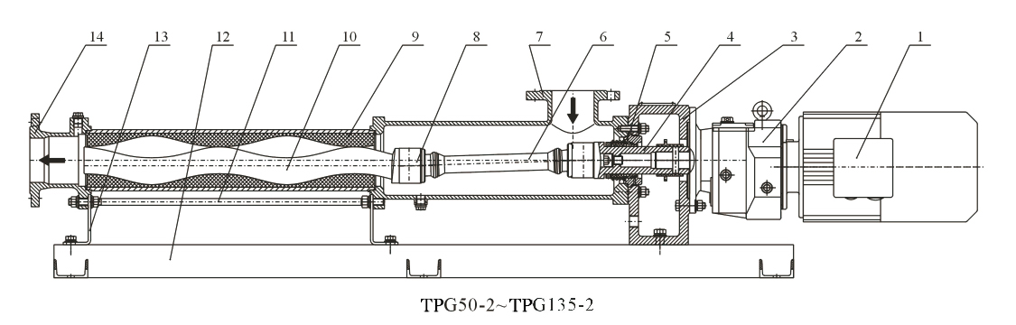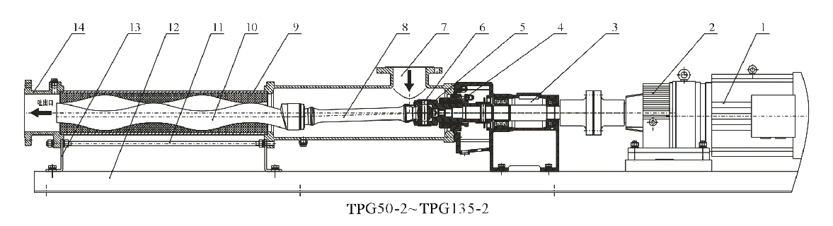 1.motor 2. Geadbox 3. Direct-Connection Support 4. Udvidelsesaksel 5.Mechanical Seal Assembly 6. Connecting Rod 7.Suction Chamber 8.Universal Joint Assembly 9.Stator 10.Rotor 11.Tie Rod 12.Base 13.Support Feet 14.Descharge Body